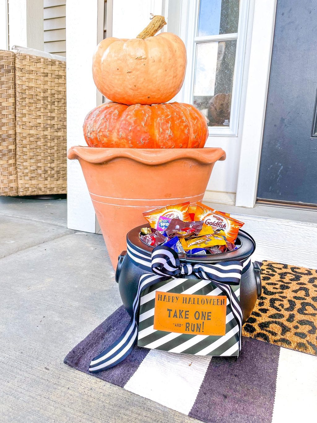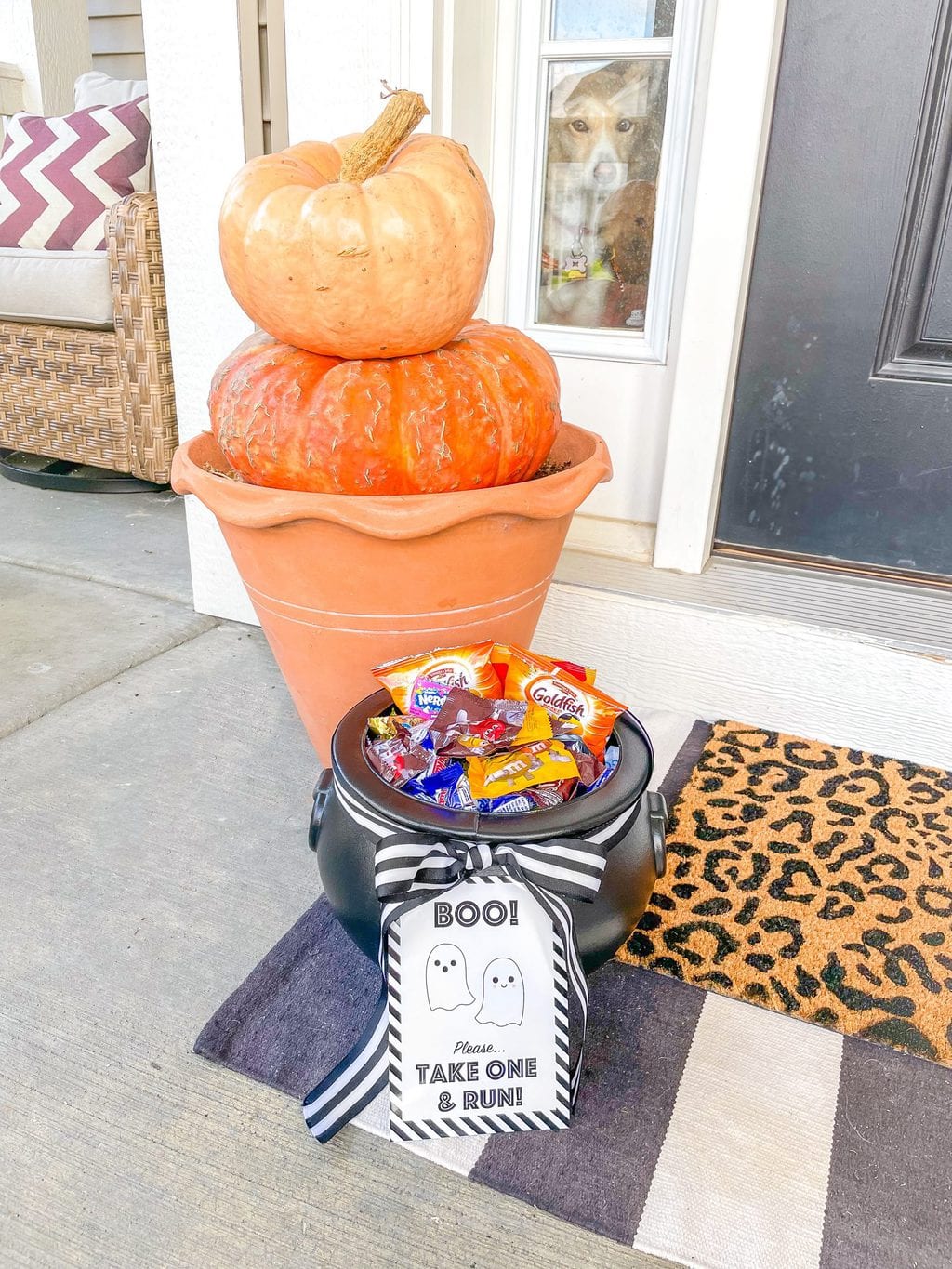 I always leave a bowl of goodies on the front step and hope for the best and write a quick and crude “Happy Halloween!” sign to avoid getting egged greet the kids.