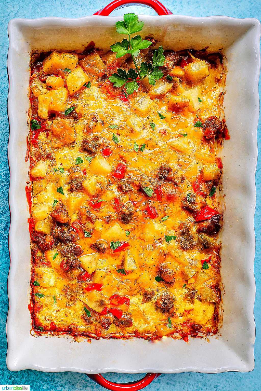 This overnight breakfast casserole is easy to assemble the night before Christmas, then bake on Christmas morning for a hearty, satisfying way to start the big day! Loaded with potatoes, peppers, sausage, and cheese, it’s sure to keep the whole family fueled up for a day of holiday festivities! ![]()