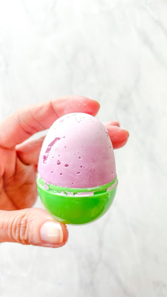 After the chalk has dried, remove it from your chalk mold of choice. If using an egg shell, tap the shell gently and peel it – just like you might peel a hard boiled egg.