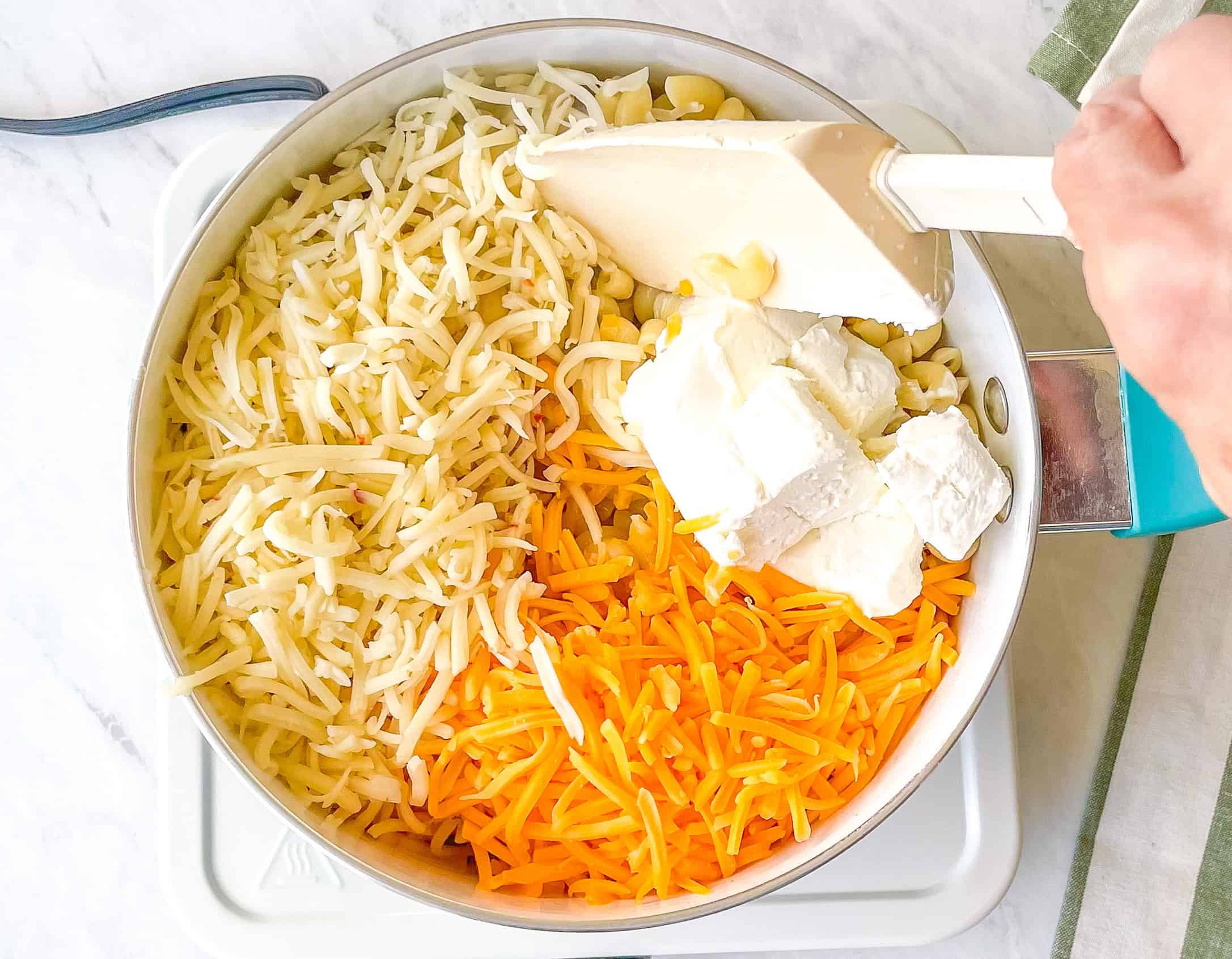 - Add pepperjack, cream cheese, 1 C. of the cheddar and 1 C. of milk to the noodles. Stir until the mixture is just melted and well combined.
