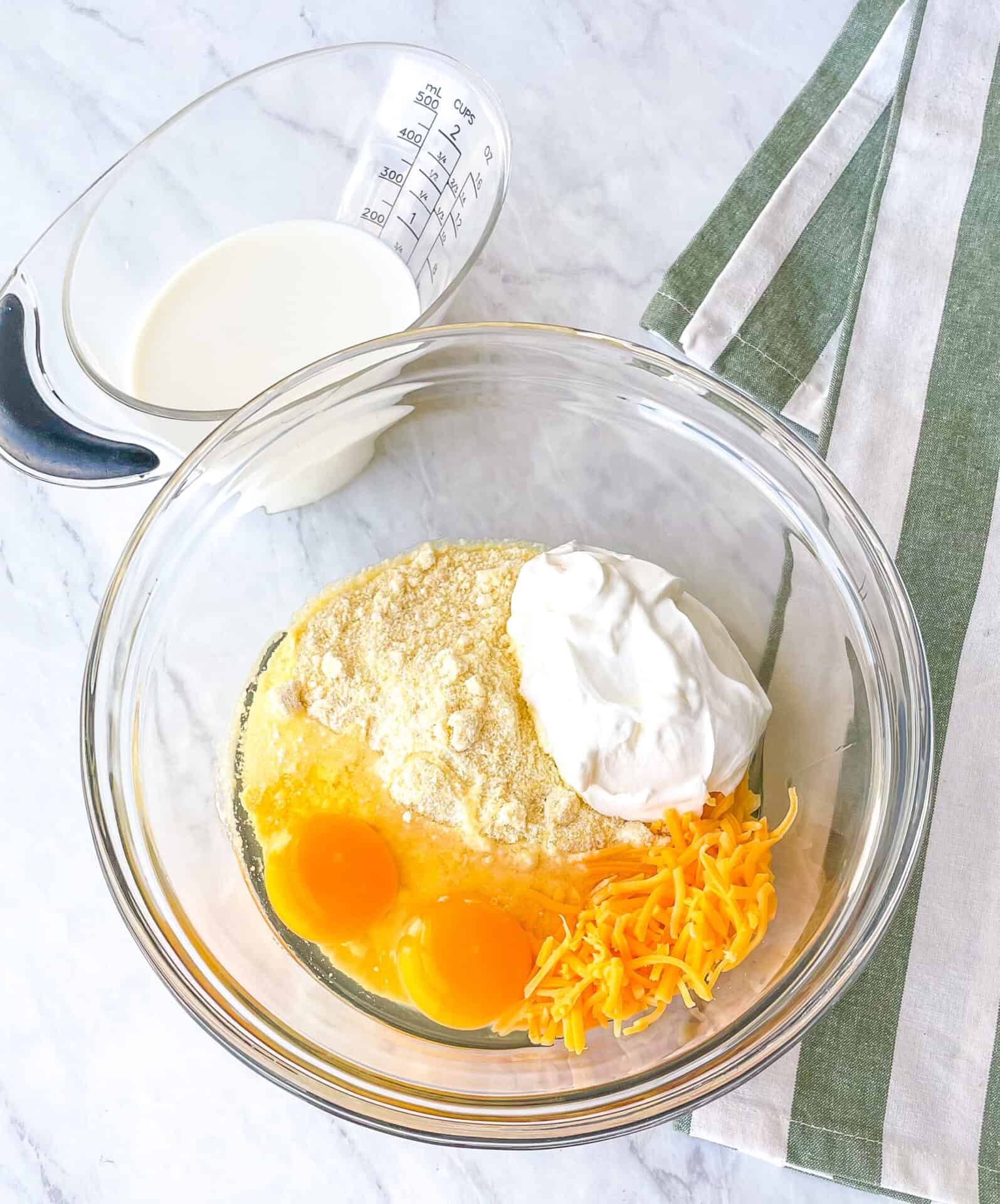 Next, mix together cornbread mix, sour cream eggs, 1/2 C. of the cheddar, and milk into a medium bowl until just combined.