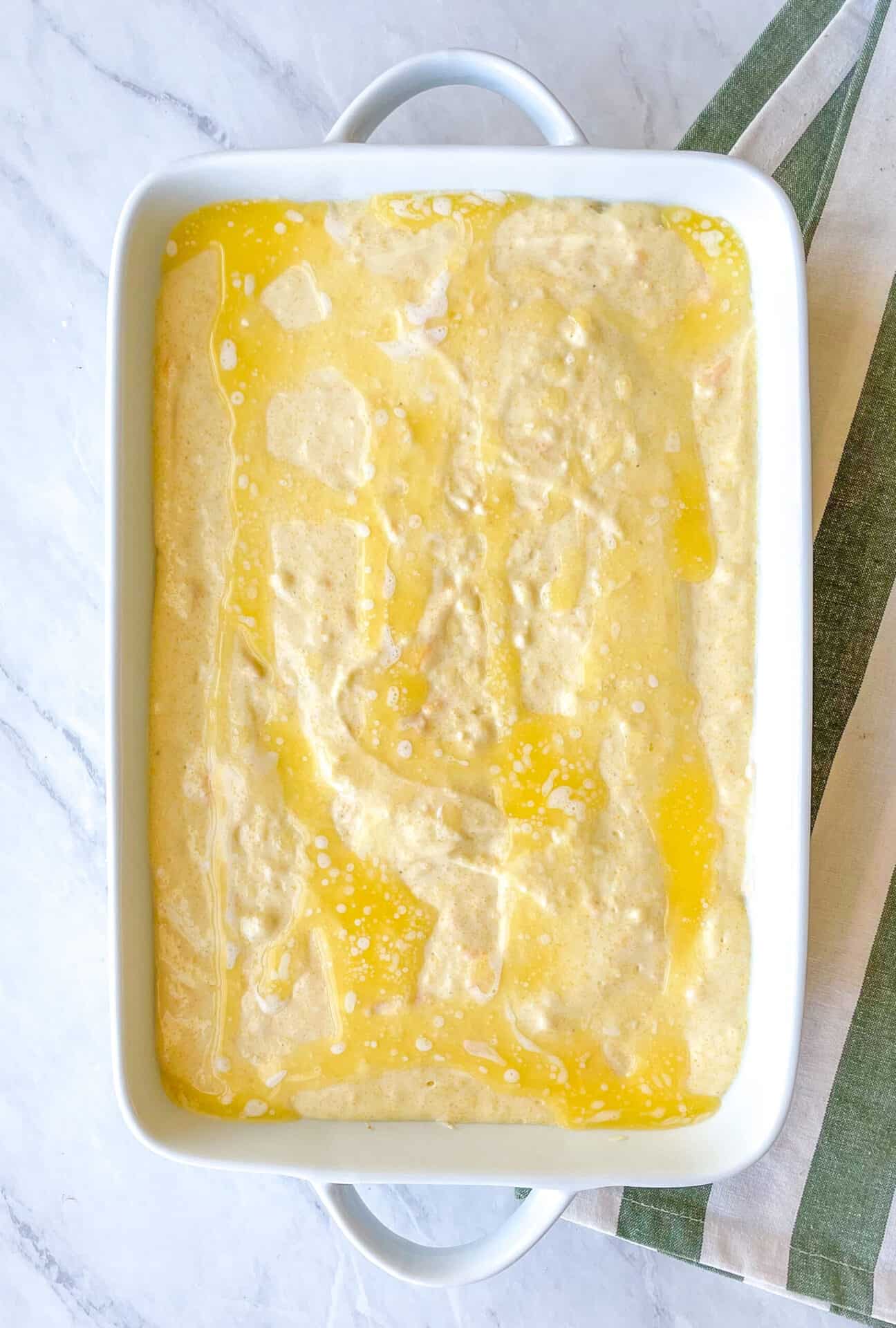 Pour into the 9×13″ pan, spreading a thin layer evenly over the macaroni and cheese mixture. Next, pour 2-3 Tbsp. of melted butter over the top. This will keep your cornbread topping flavorful and moist!