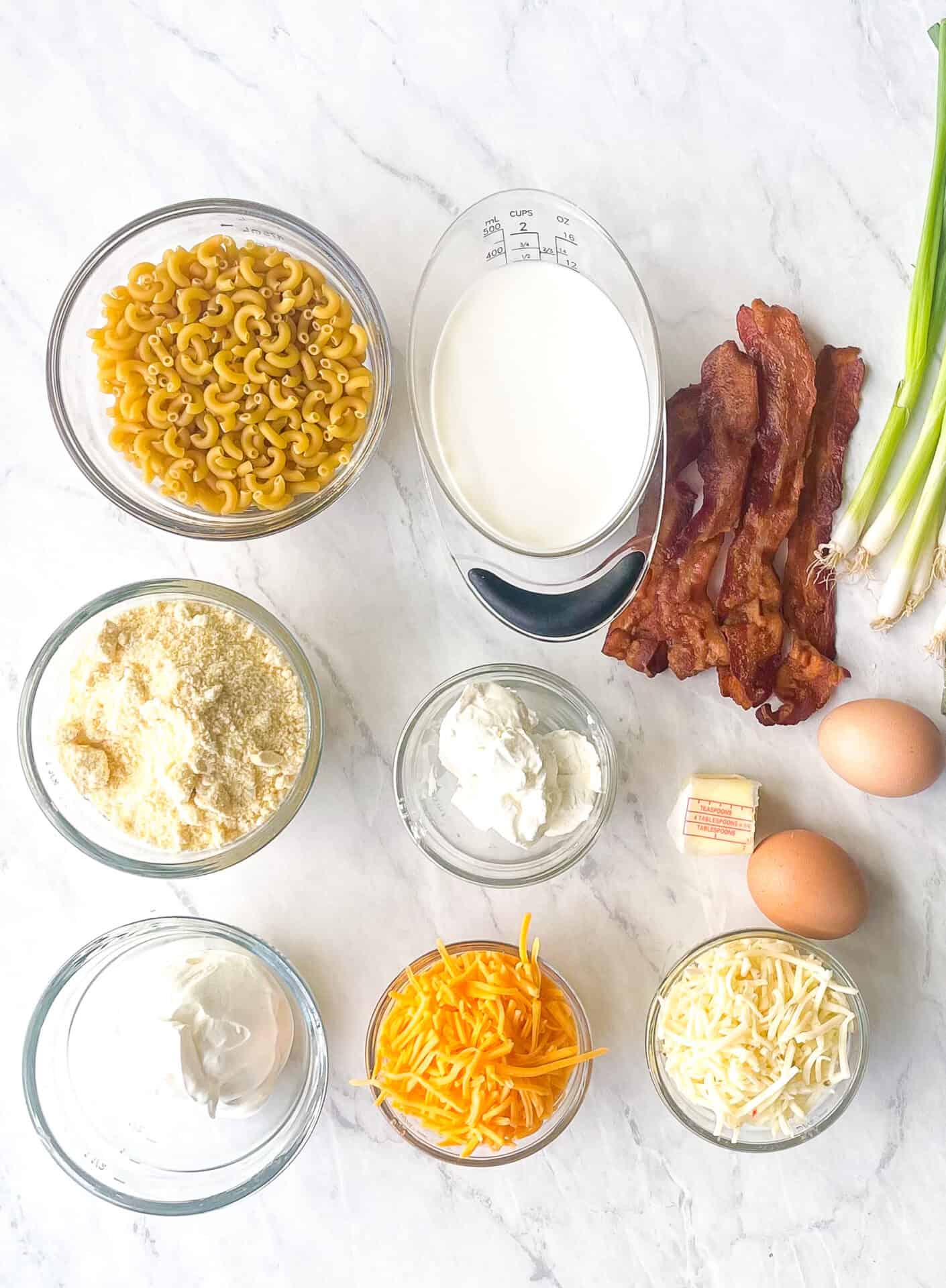This recipe comes together with ingredients you might already have on hand: I got the pasta, milk, cheese, cornbread mix, sour cream, bacon, and green onions during my latest grocery run to Walmart.