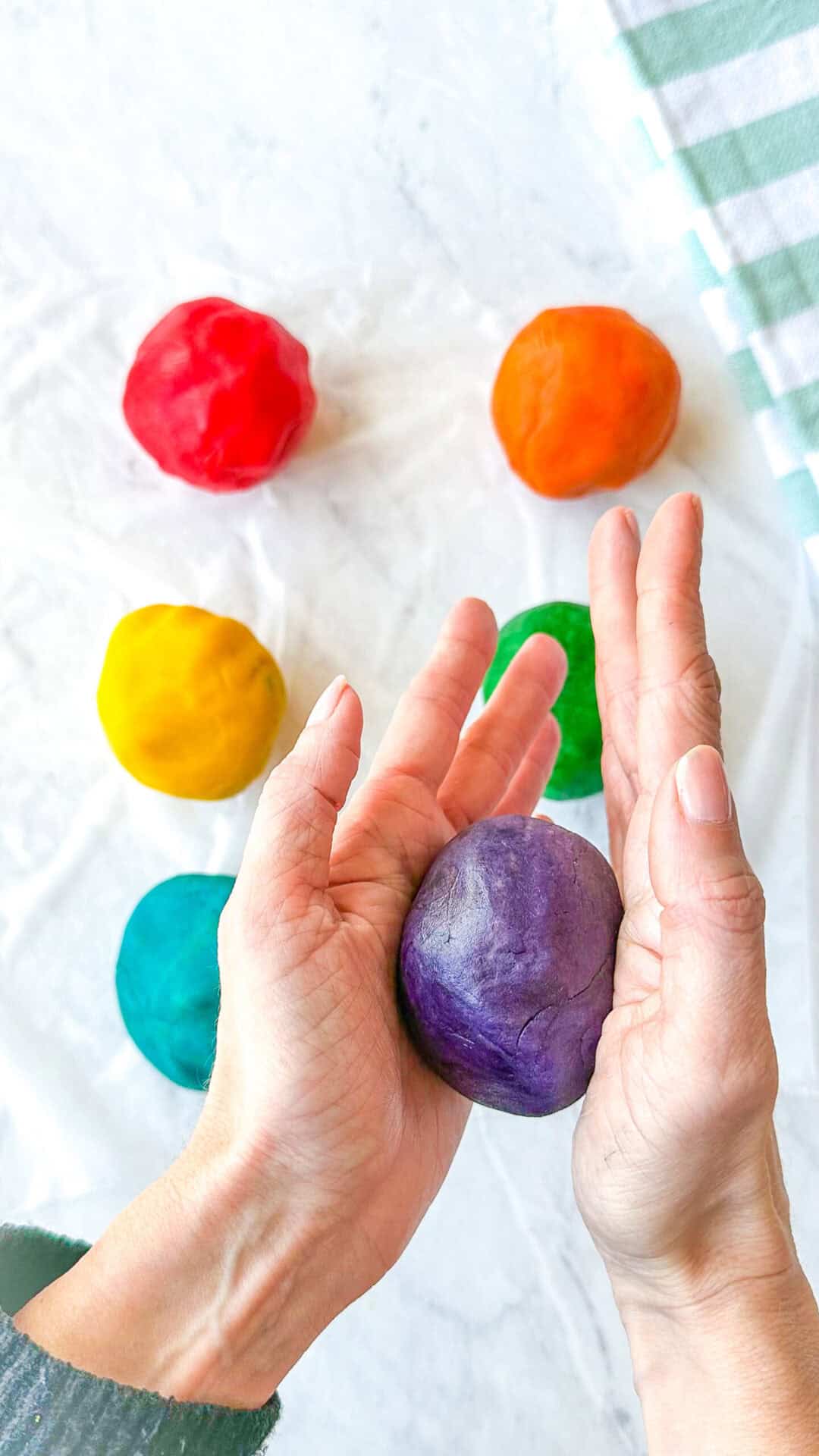 - Divide dough into 6 even portions. Add 2-3 drops of gel food coloring to each portion until desired color is created.